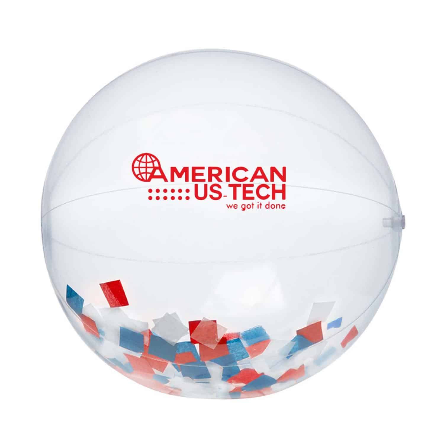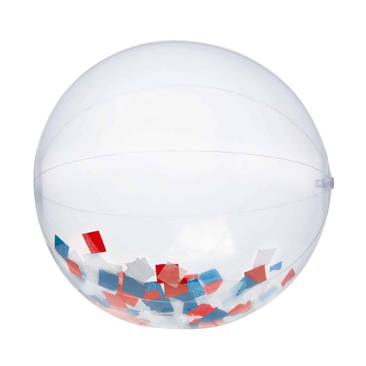 Add a little shine and glamour to your next promotion with this eye-catching confetti-filled beach ball! The clear ball is filled with red, white and blue confetti for a truly unique promotional item. It can be customized with an imprint of your company’s name, logo and marketing slogan before you add it to promotions at concerts, outdoor festivals, company picnics and more. Keep your brand in the air to maintain a great buzz about your services! Complies with CPSIA. 10.19″ Diameter